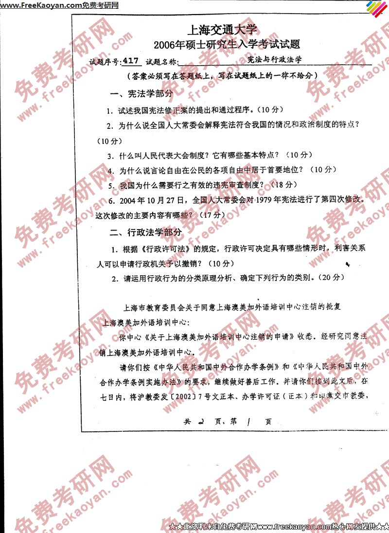 上海交通大学2006年考研真题-宪法与行政法学