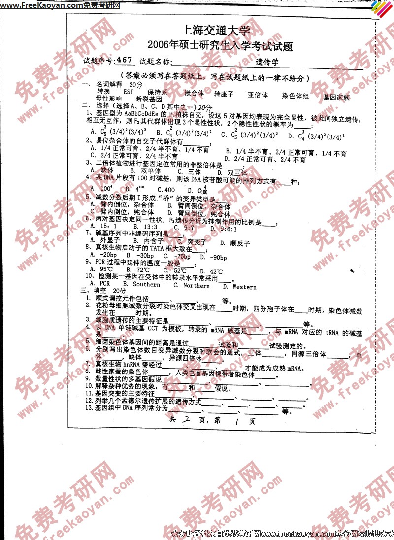 上海交通大学2006年考研真题-遗传学