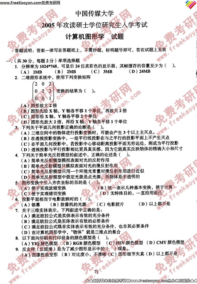 相关话题/考研真题 计算机 中国传媒大学 图形学