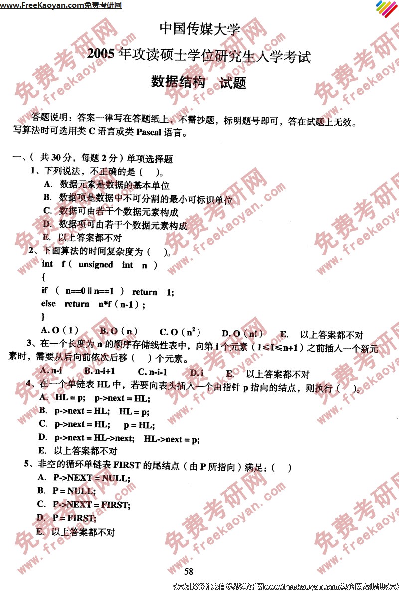 专业课考研经验 本站小编 FreeKaoyan 2018-01-23中国传媒大学2005年考研真题-软件工程