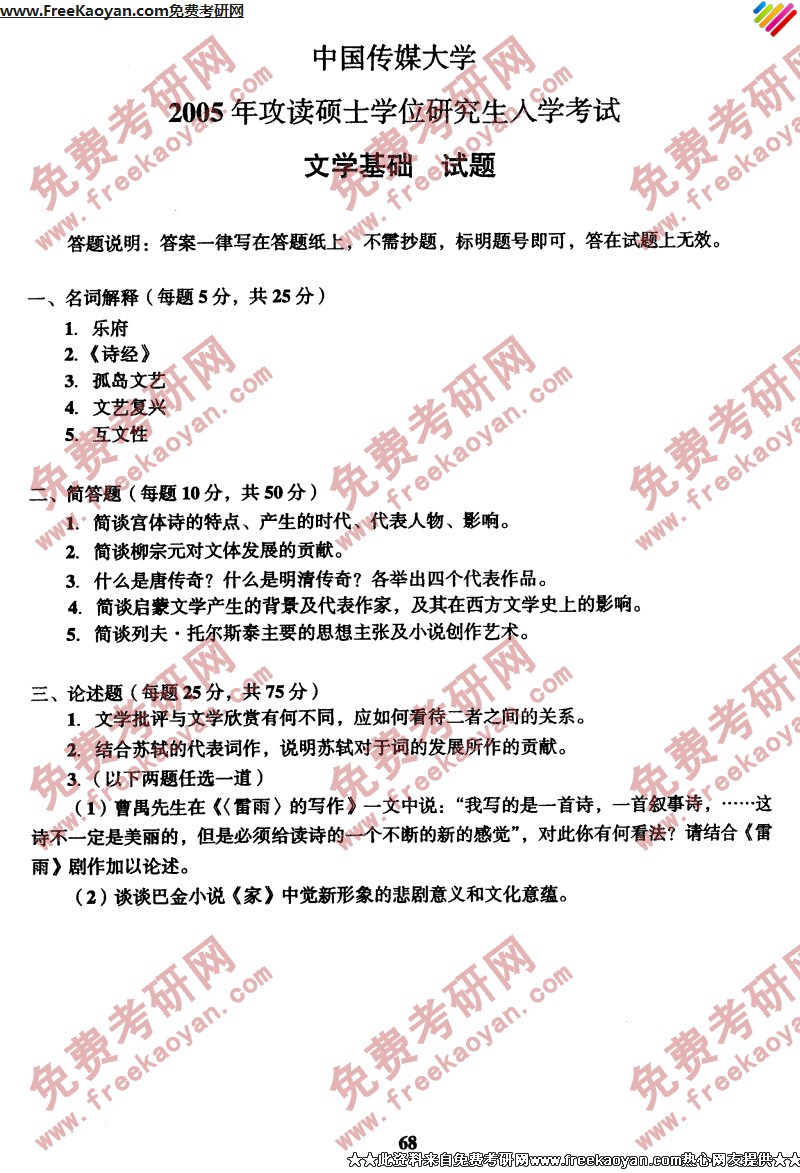 相关话题/中国传媒大学 考研真题 文学基础
