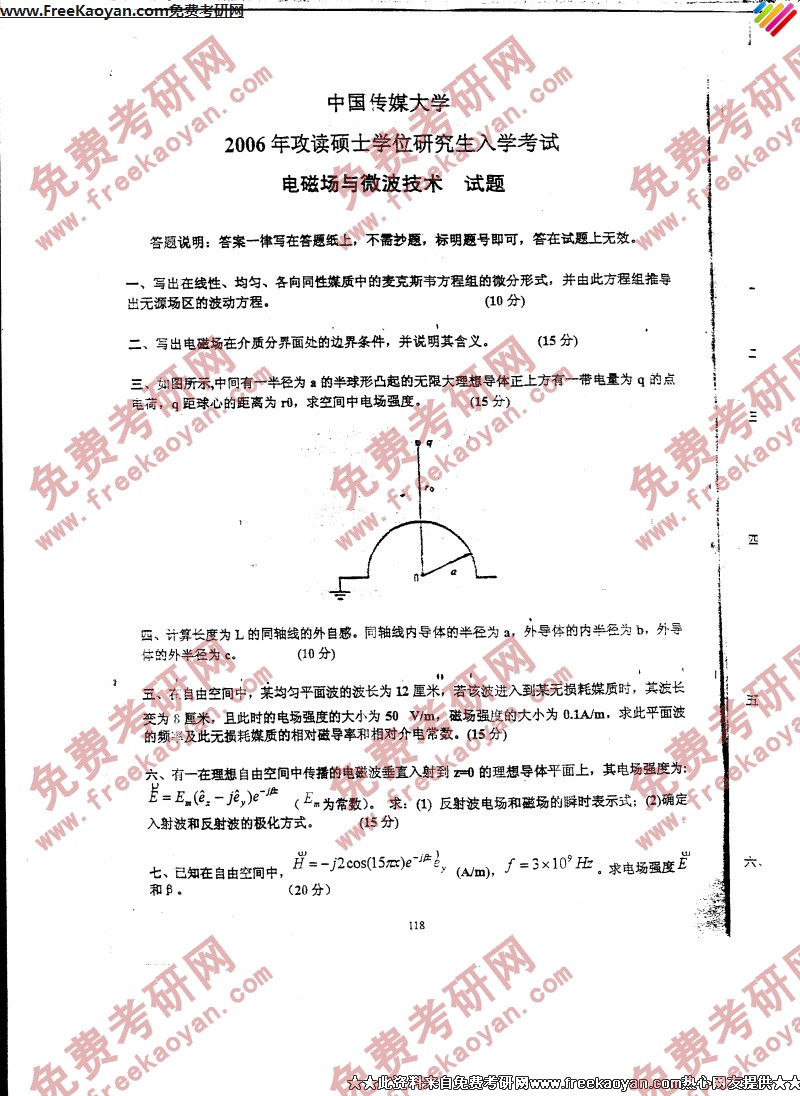 中国传媒大学2006年考研真题-电磁场与微波技术