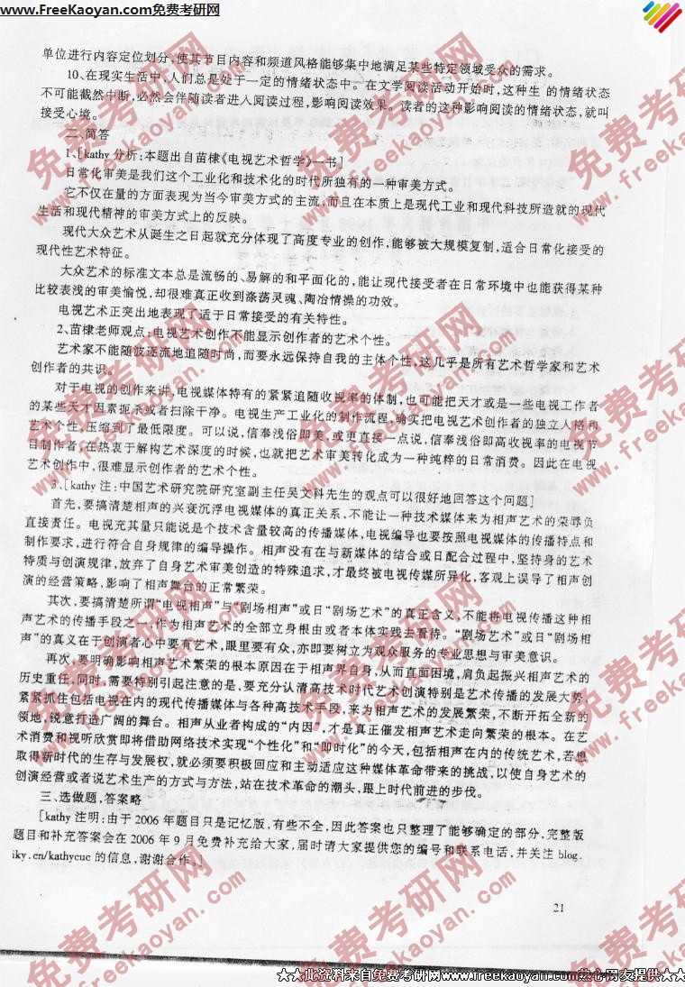 专业课考研经验 本站小编 FreeKaoyan 2018-01-23中国传媒大学2006年考研真题-电视文化传播