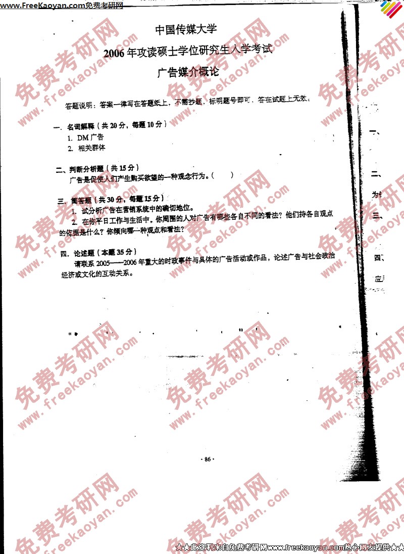 专业课考研经验 本站小编 FreeKaoyan 2018-01-23中国传媒大学2006年考研真题-电视文化传播