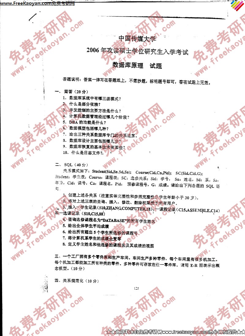 中国传媒大学2006年考研真题-数据库原理