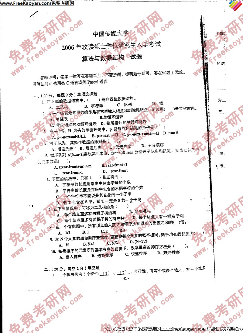 专业课考研经验 本站小编 FreeKaoyan 2018-01-23中国传媒大学2006年考研真题-数据结构