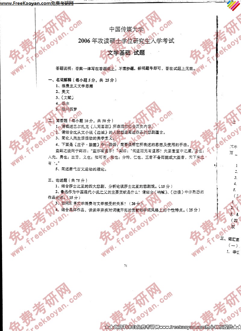 中国传媒大学2006年考研真题-文学基础