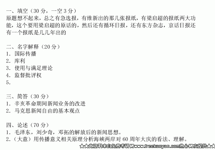 专业课考研经验 本站小编 FreeKaoyan 2018-01-23新闻史论 一、名词解释:《学灯》安莎社客观性反客里空 二、简答:蔡元培的新闻活动新闻传播的社会控制 三、论述:发达国家和发展中国家关于"传播新秩序"理论的不同中西新闻传播观念的异同 四、分析: 材料:是张君案时我英勇的人民警察利用媒介放"烟雾弹",声东击西,把张老大在重庆干掉 1 、这事做的咋样? ...