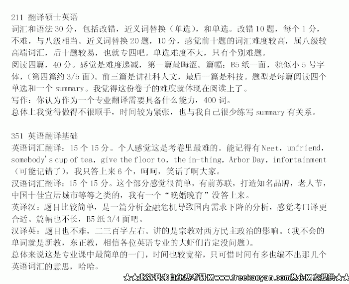 专业课考研经验 本站小编 FreeKaoyan 2018-01-23厦门大学2004年招收攻读硕士学位研究生入 学 考 试 试 题招生专业: 英语语言文学 考试科目及代码:写作与英汉互译 319研究方向:_________________注意:答案必须标明题号,按序写在专用答题纸上,写在本试卷上或草稿纸上者一律不给分。I. Translate the followi ...