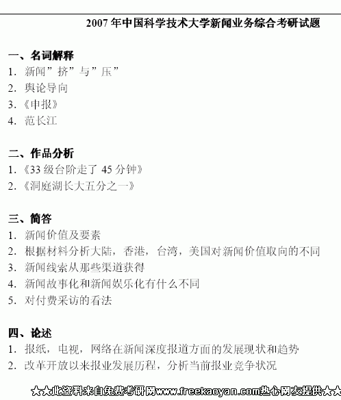 专业课考研经验 本站小编 FreeKaoyan 2018-01-23新闻传播综合一 名词解释 50分 1沃尔特2 北大新闻学研究会 3 时务文体 4 镜中人 5 虚拟社区 6 采访权 7 全媒体 8 9 公共广播系统10BBC材料分析 4个 40分1 政府和新闻界之间存在冲突的平衡制约机制2 公民新闻 3 作者传递的是文字 读者反映的是意义 4 某地政府聘请媒体基 ...