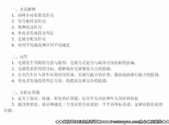 专业课考研经验 本站小编 FreeKaoyan 2018-01-23一、名词解释(排名不分先后)固定延误 ITS 行驶时间 停车泊位周转率 视力适应 车头间距出行(OD)调查 车辆事故致死率 二、简答:1,从心理和生理分析为什么严打酒后驾车2,85%位车速3,交通需求四阶段4,作为城市居民采用什么交通方式进入低碳排放5,城市停车问题,停车场种类6,山区公路如何采 ...