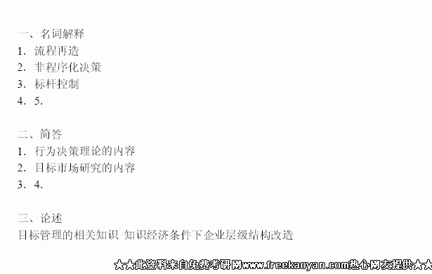 专业课考研经验 本站小编 FreeKaoyan 2018-01-23管理学一.名词解释1.管理2.管理方法3.组织文化4.人本原理5.整体性原理6.正强化二.简答题1.管理者的技能有那些2.塑造组织文化的主要途径3.非正式沟通的特点4.创新的过程5.非正式组织的影响6.用管理理论论述“南风法则”三.论述题1.科学决策的过程及其启示2.结合实际说明激励实务3.领导艺术 ...