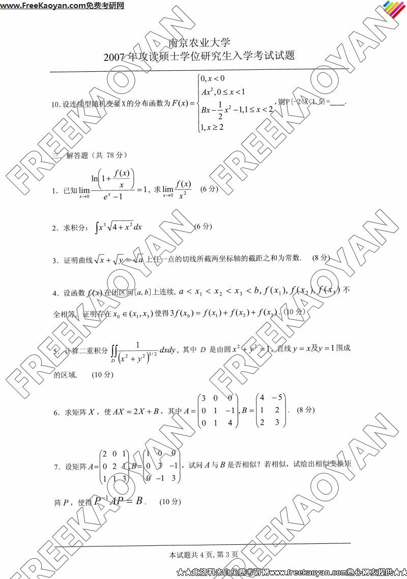 南京农业大学2007年考研真题-高等数学(3)