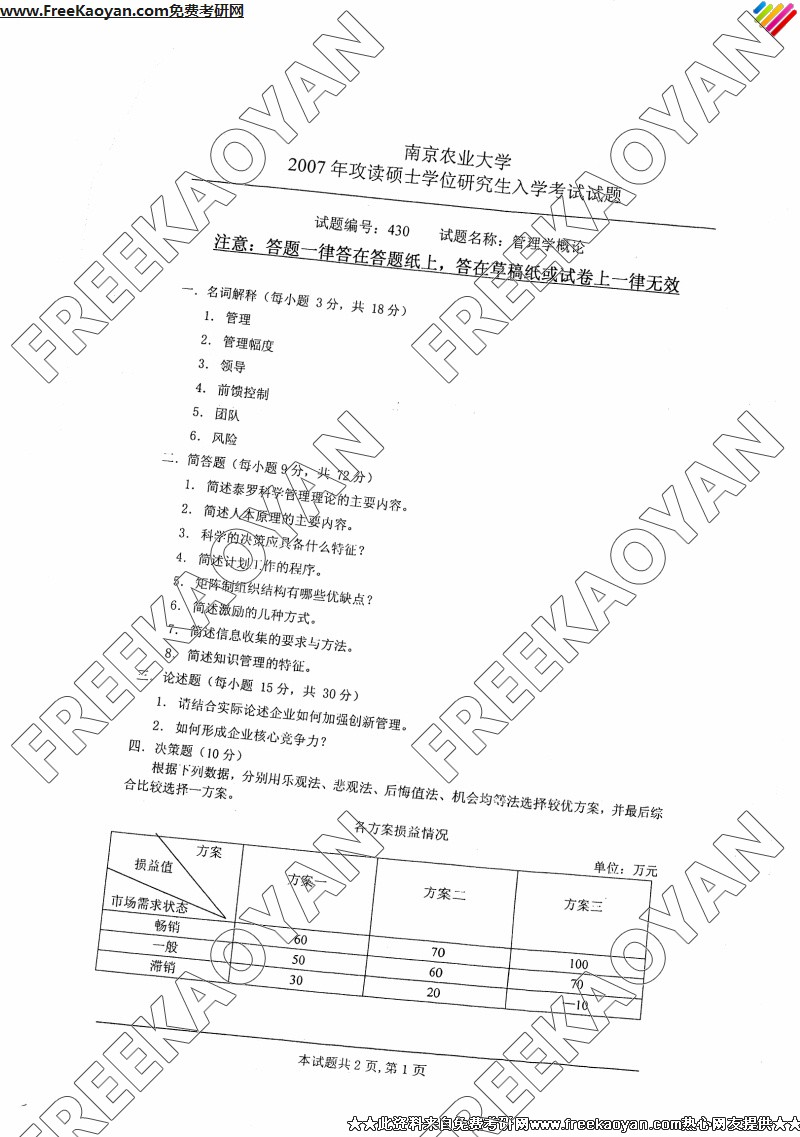 专业课考研经验 本站小编 FreeKaoyan 2018-01-23选择题做太快了只记得3个:1.经营预算中最基本和最关键的是(销售预算)2.职能职权的概念3.BCG矩阵中的现金牛简答题:1.管理者的技能及在不同管理层次的关系2.计划中的四大问题及相对应的管理概念3.团队的类型及向过程团队演变必须面对的挑战4.记不起来了。。。5有效控制的原则论述题:1.根据管理思想 ...
