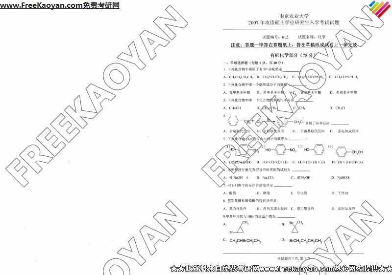 南京农业大学2007年考研真题-化学