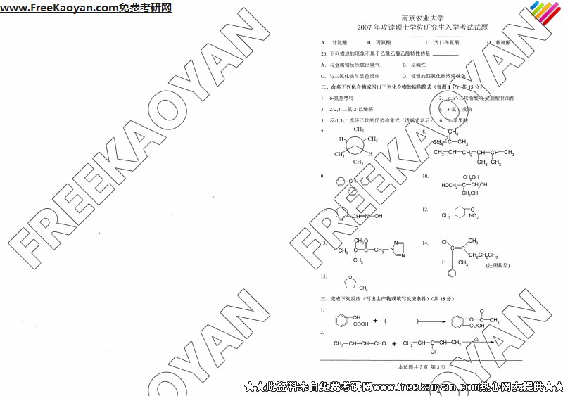 南京农业大学2007年考研真题-化学(3)
