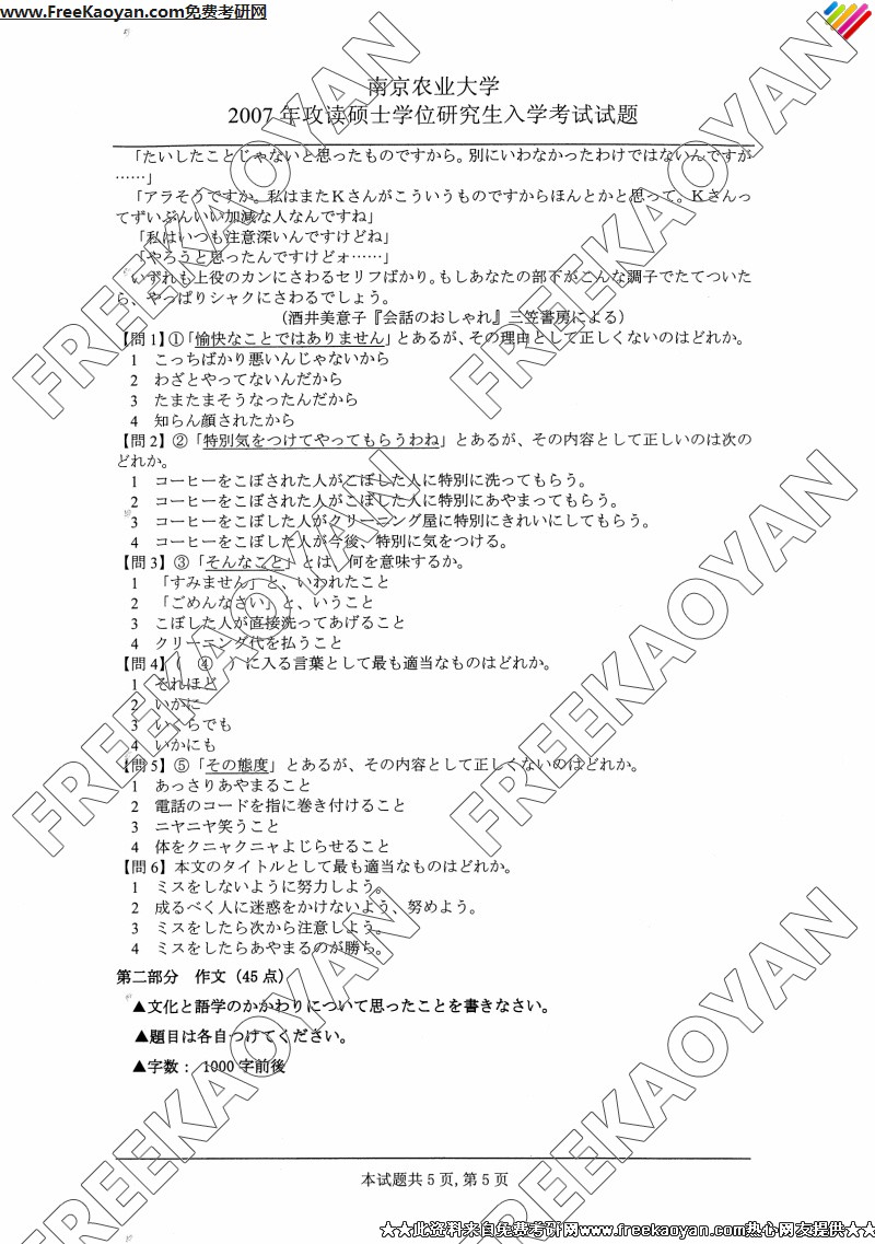 南京农业大学2007年考研真题-日语读解与写作(5)