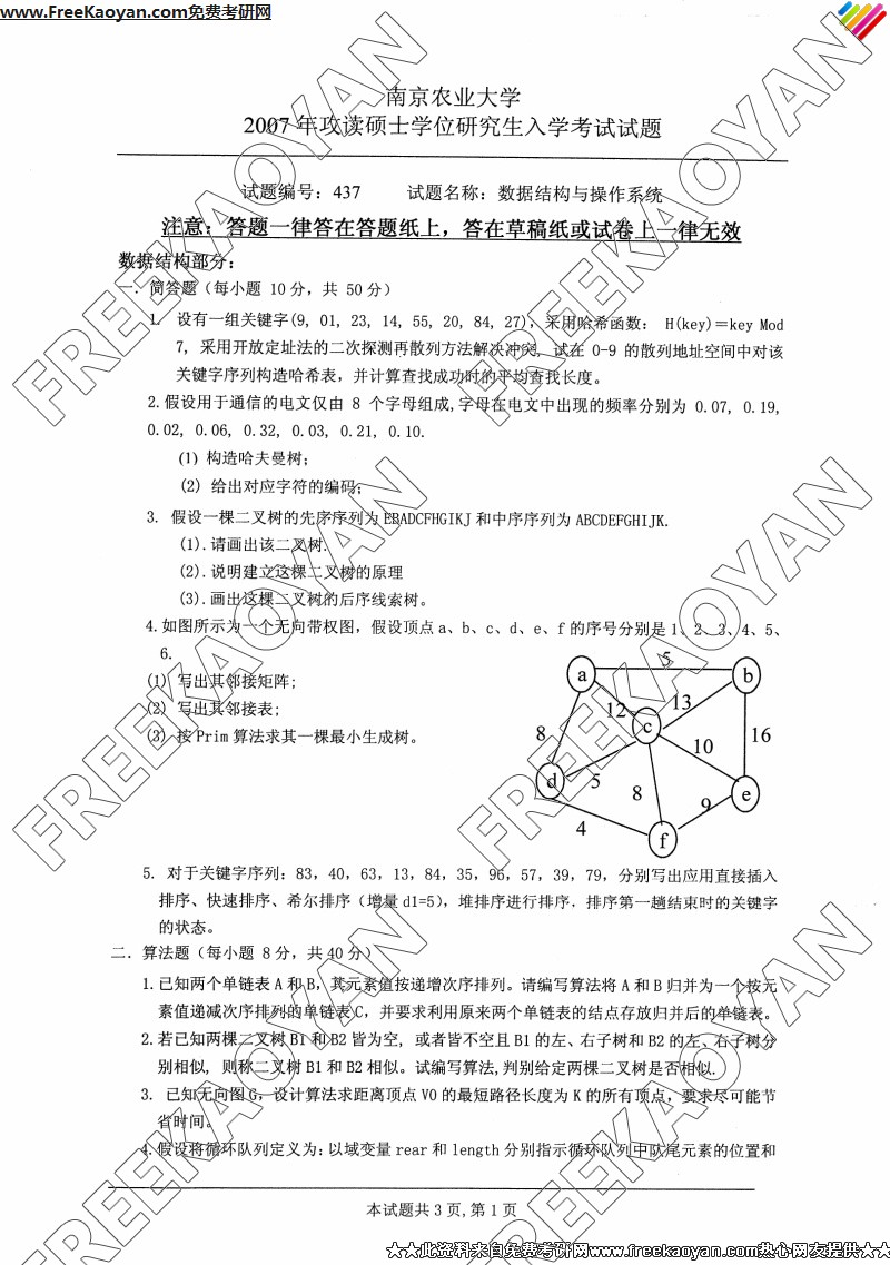 南京农业大学2007年考研真题-数据结构与操作系统