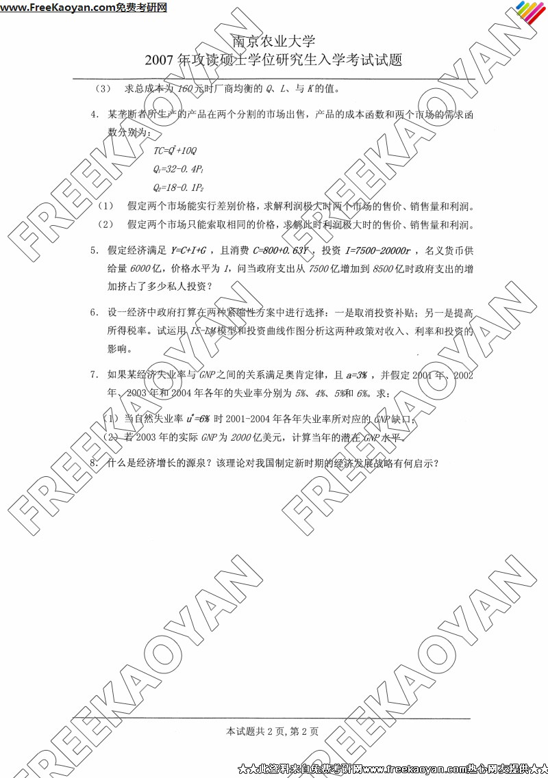 南京农业大学2007年考研真题-西方经济学(2)