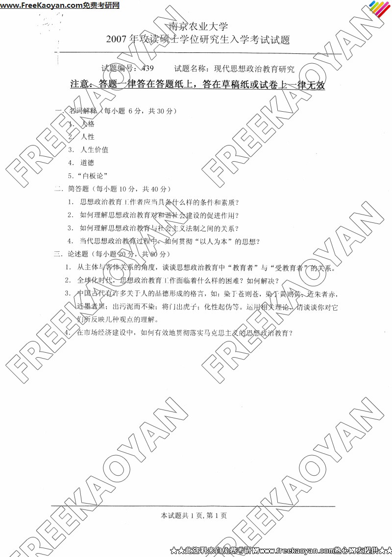 南京农业大学2007年考研真题-现代思想政治教育研究