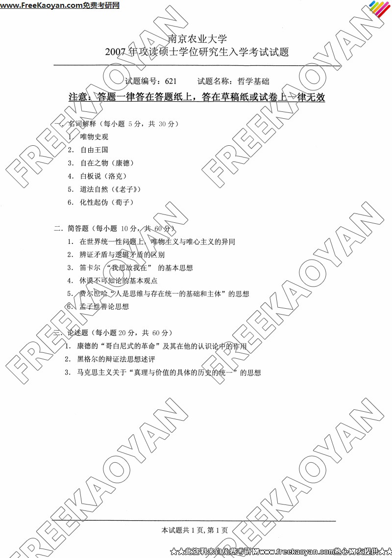 南京农业大学2007年考研真题-哲学基础