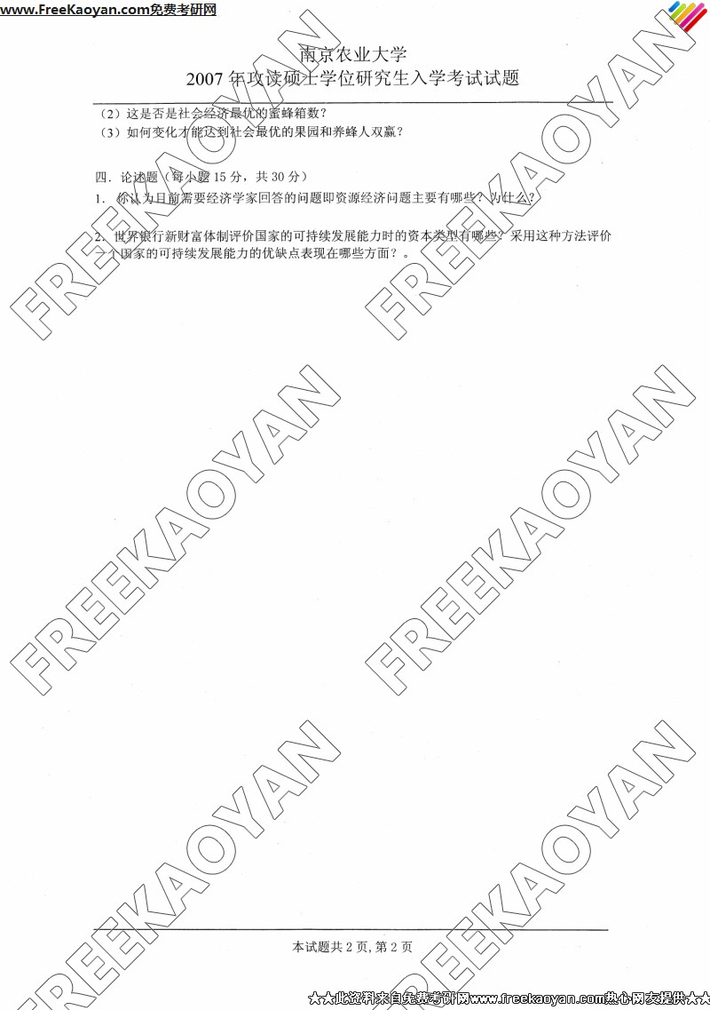 南京农业大学2007年考研真题-资源与环境经济学(2)