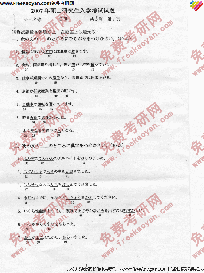 专业课考研经验 本站小编 FreeKaoyan 2018-01-23燕山大学2007年考研真题-基础日语