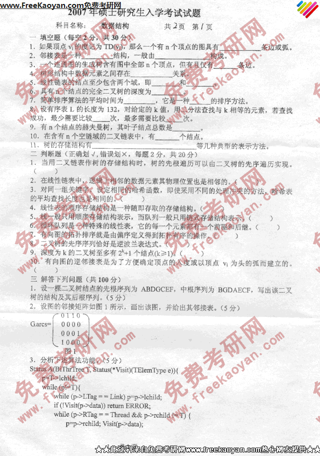 燕山大学2007年考研真题-数据结构