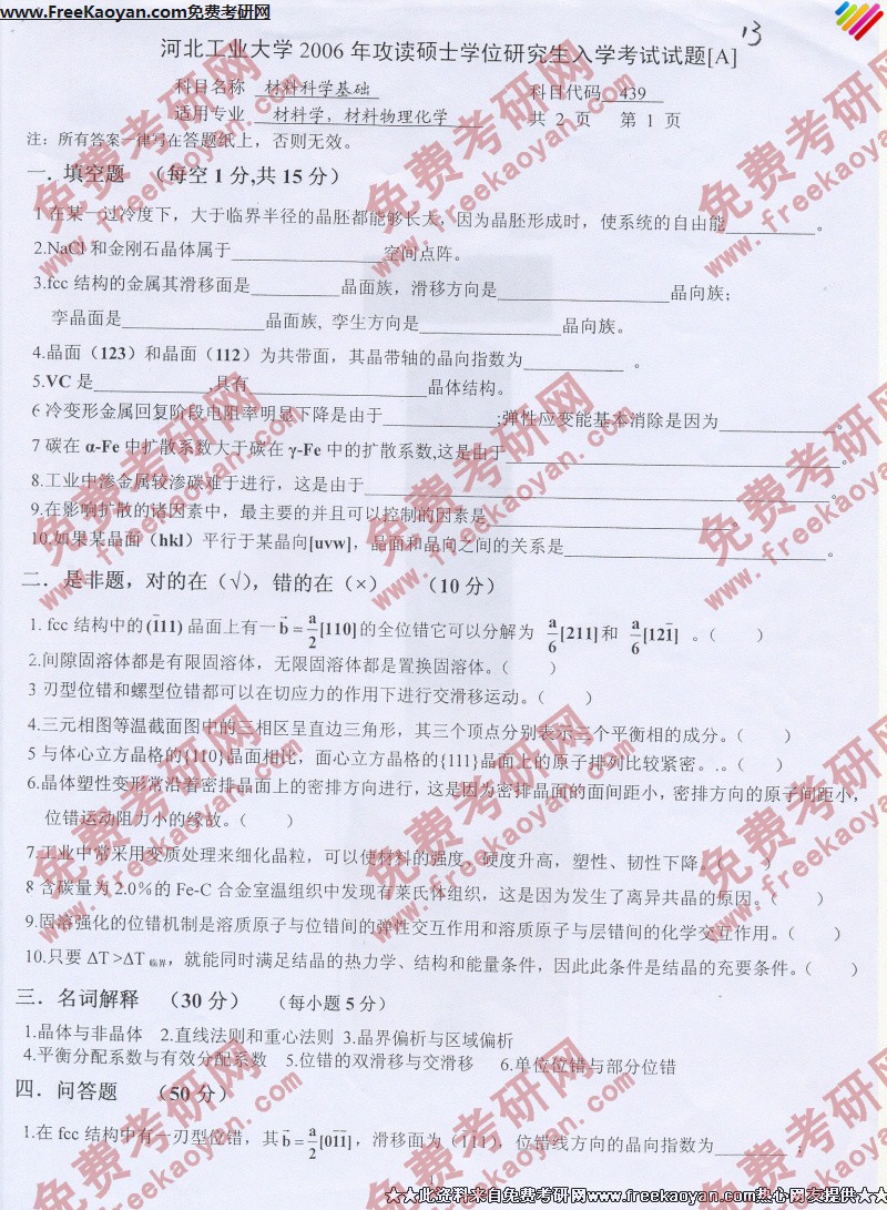 专业课考研经验 本站小编 FreeKaoyan 2018-01-23河北工业大学2006年考研真题-半导体物理