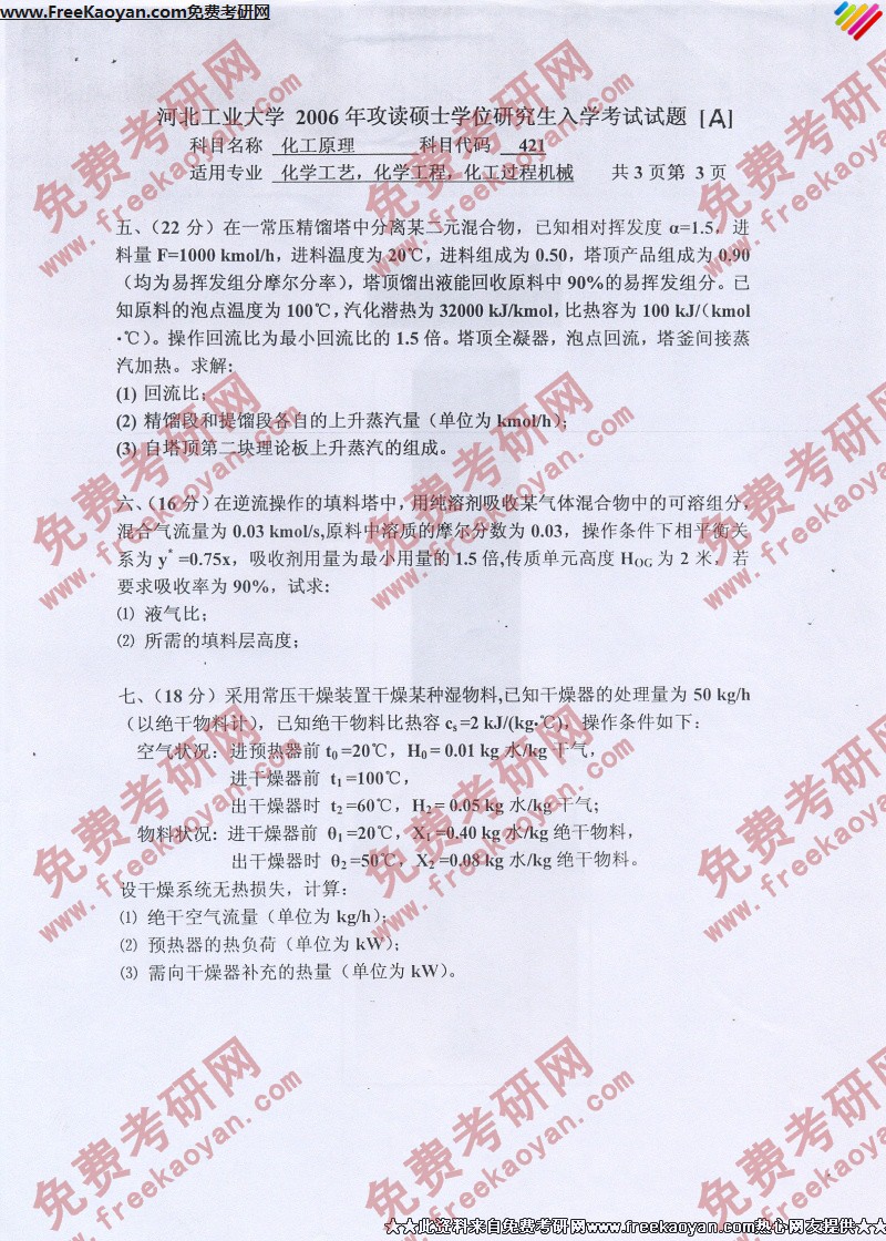 河北工业大学2006年考研真题-化工原理(3)