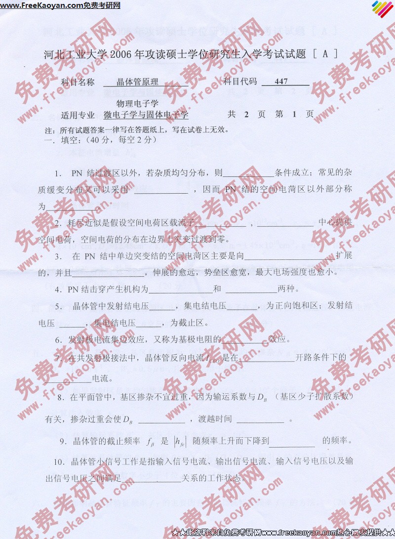 河北工业大学2006年考研真题-晶体管原理