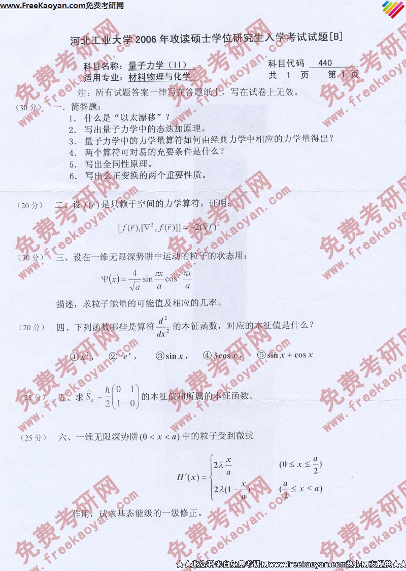 专业课考研经验 本站小编 FreeKaoyan 2018-01-23河北工业大学2006年考研真题-量子力学1