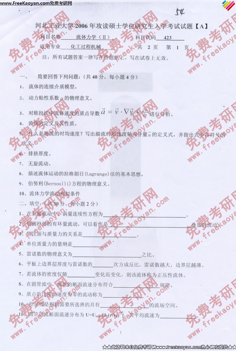 专业课考研经验 本站小编 FreeKaoyan 2018-01-23河北工业大学2006年考研真题-流体力学1
