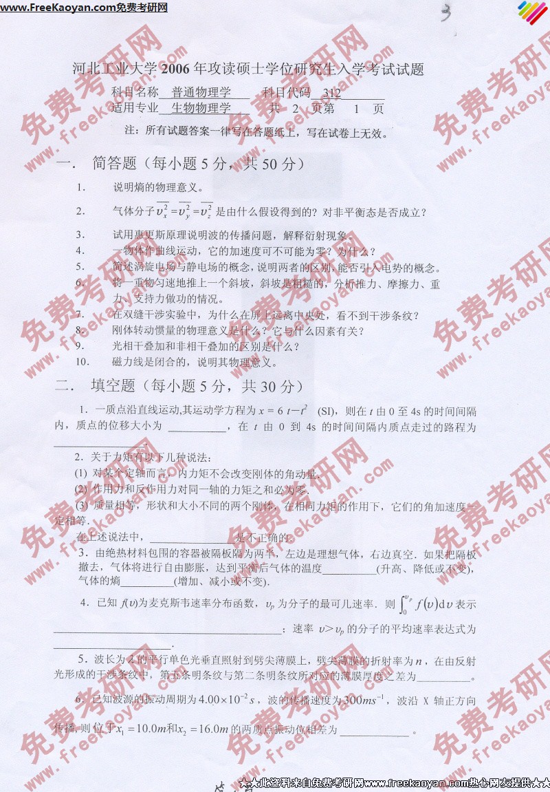 专业课考研经验 本站小编 FreeKaoyan 2018-01-23河北工业大学2006年考研真题-流体力学1