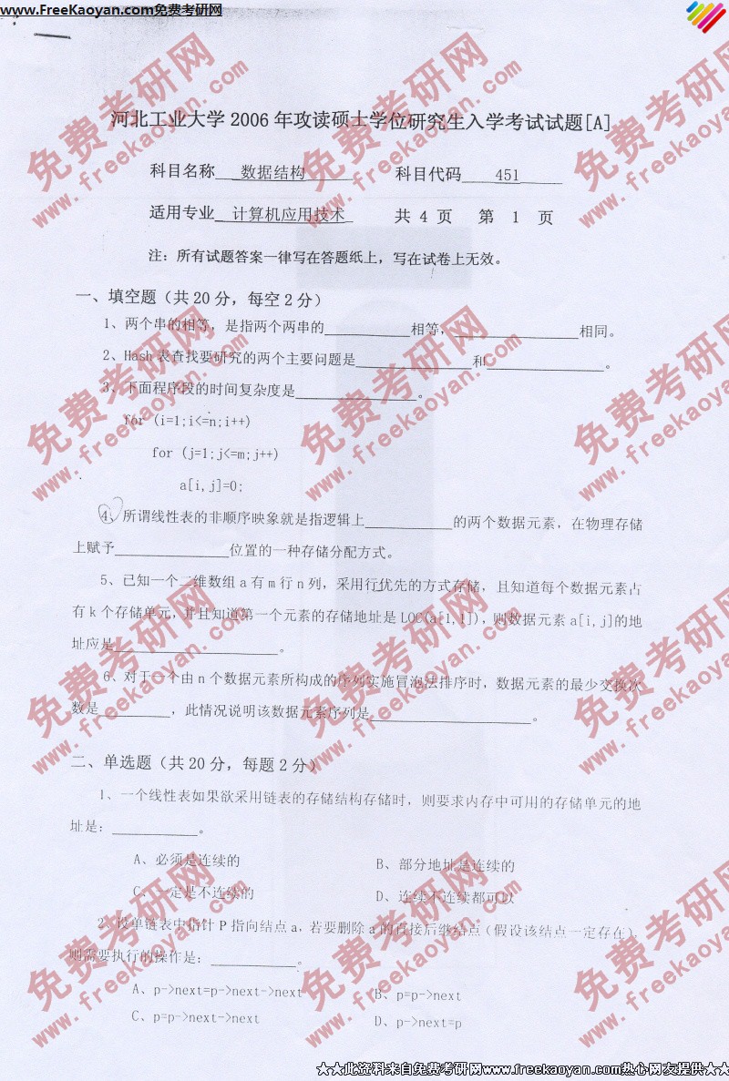 专业课考研经验 本站小编 FreeKaoyan 2018-01-23河北工业大学2006年考研真题-离散数学