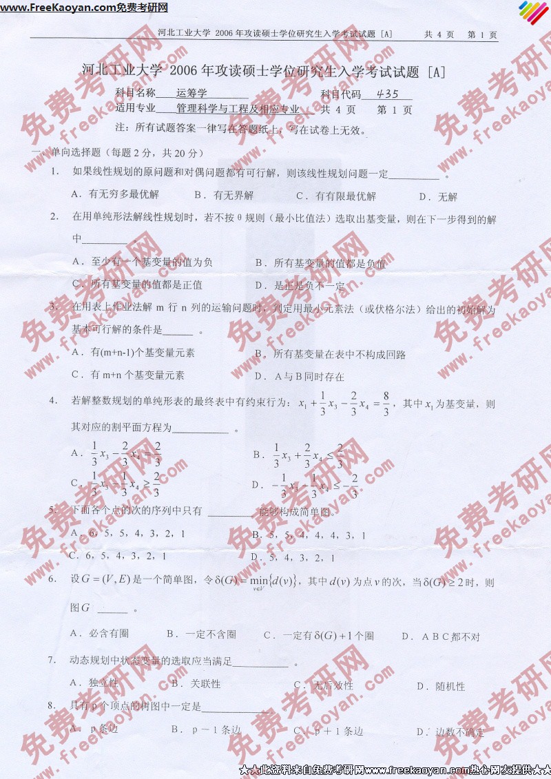 河北工业大学2006年考研真题-运筹学
