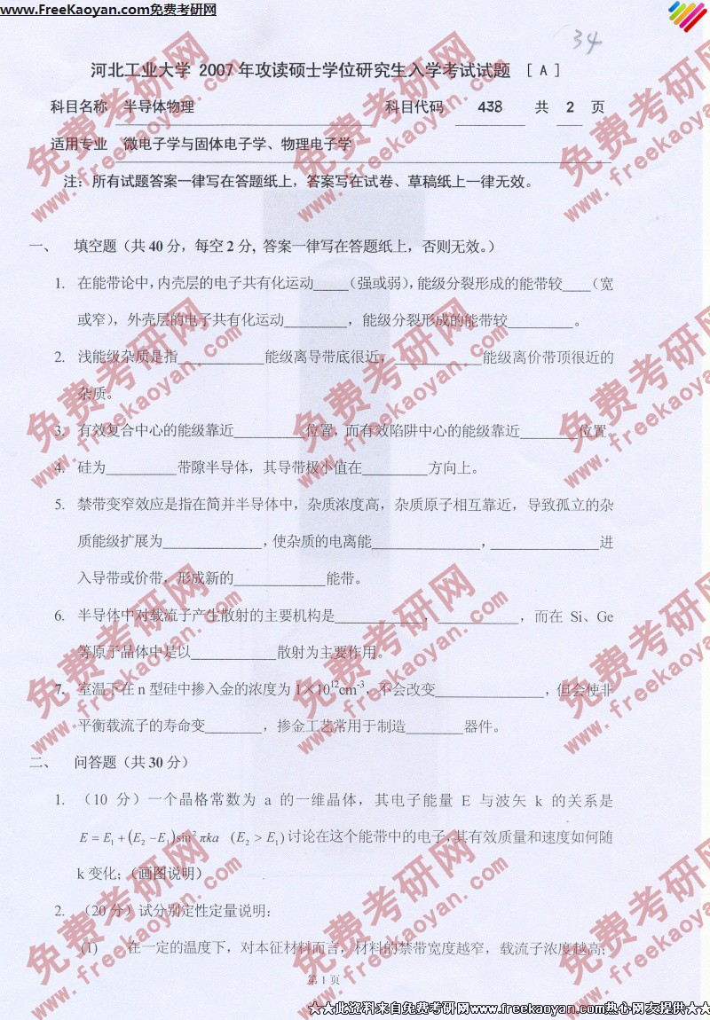 专业课考研经验 本站小编 FreeKaoyan 2018-01-23河北工业大学2006年考研真题-物理化学425