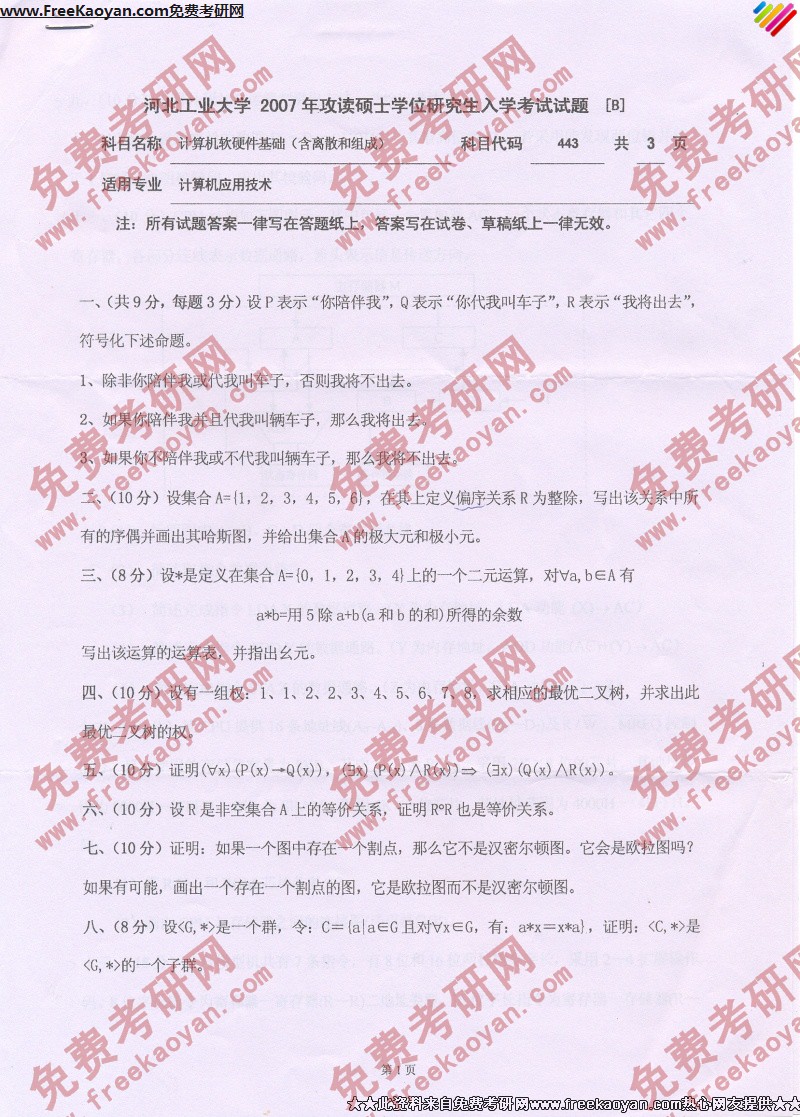 河北工业大学2007年考研真题-计算机软硬件基础(含离散数学和组成)