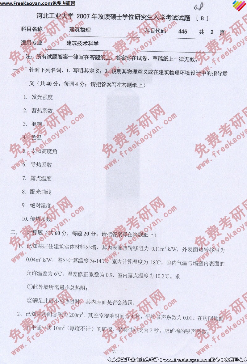 专业课考研经验 本站小编 FreeKaoyan 2018-01-23河北工业大学2007年考研真题-建筑构造与建筑物理