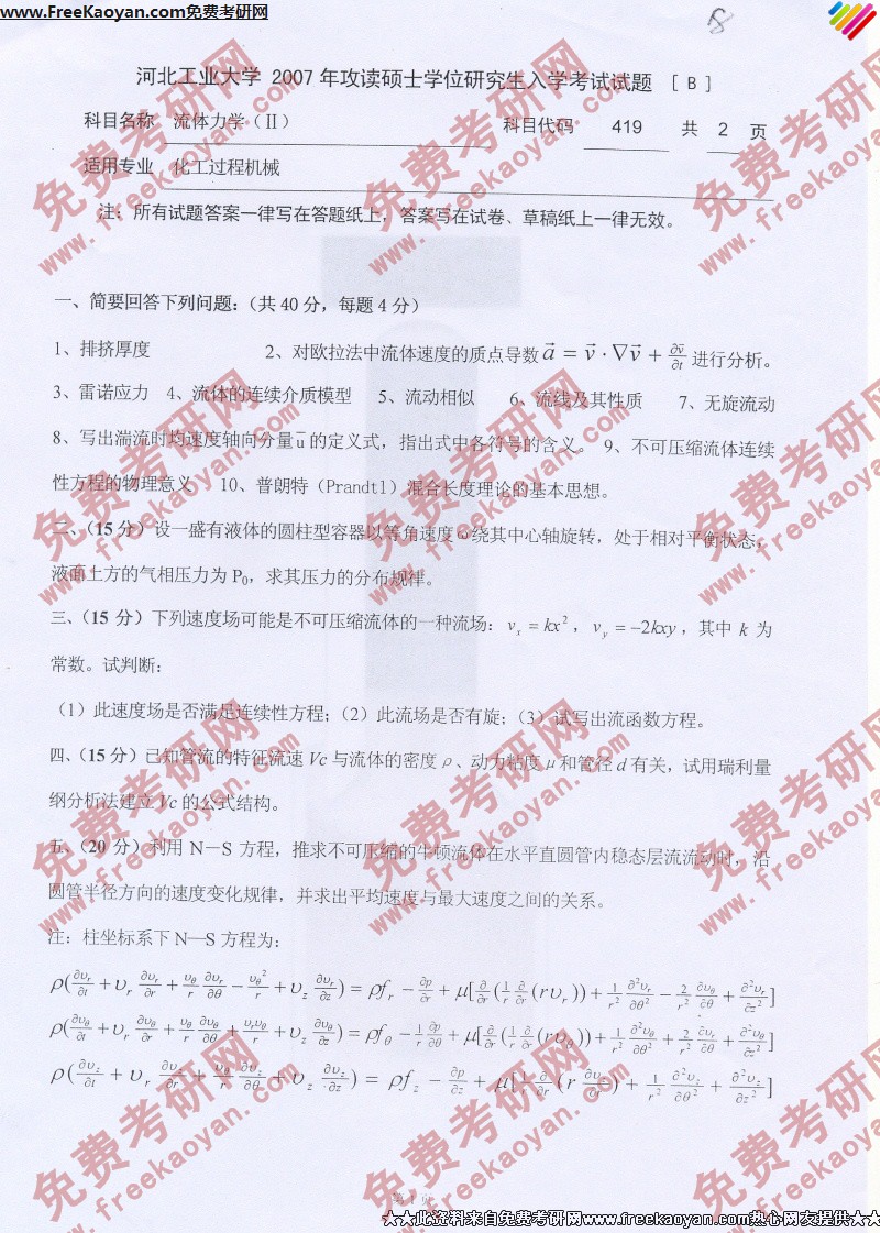 专业课考研经验 本站小编 FreeKaoyan 2018-01-23河北工业大学2007年考研真题-流体力学1