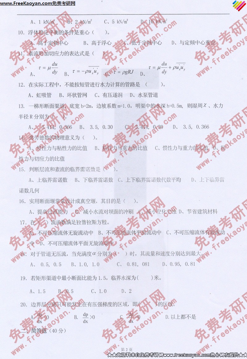专业课考研经验 本站小编 FreeKaoyan 2018-01-23河北工业大学2007年考研真题-流体力学2