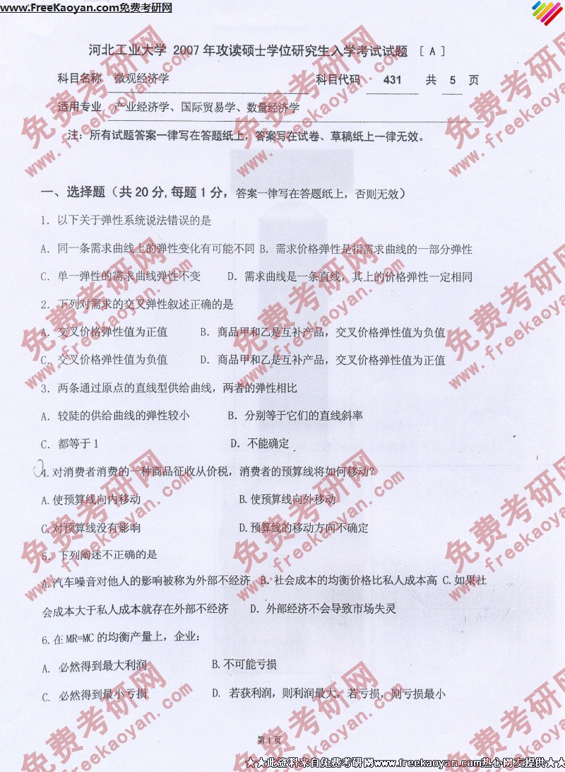 河北工业大学2007年考研真题-微观经济学