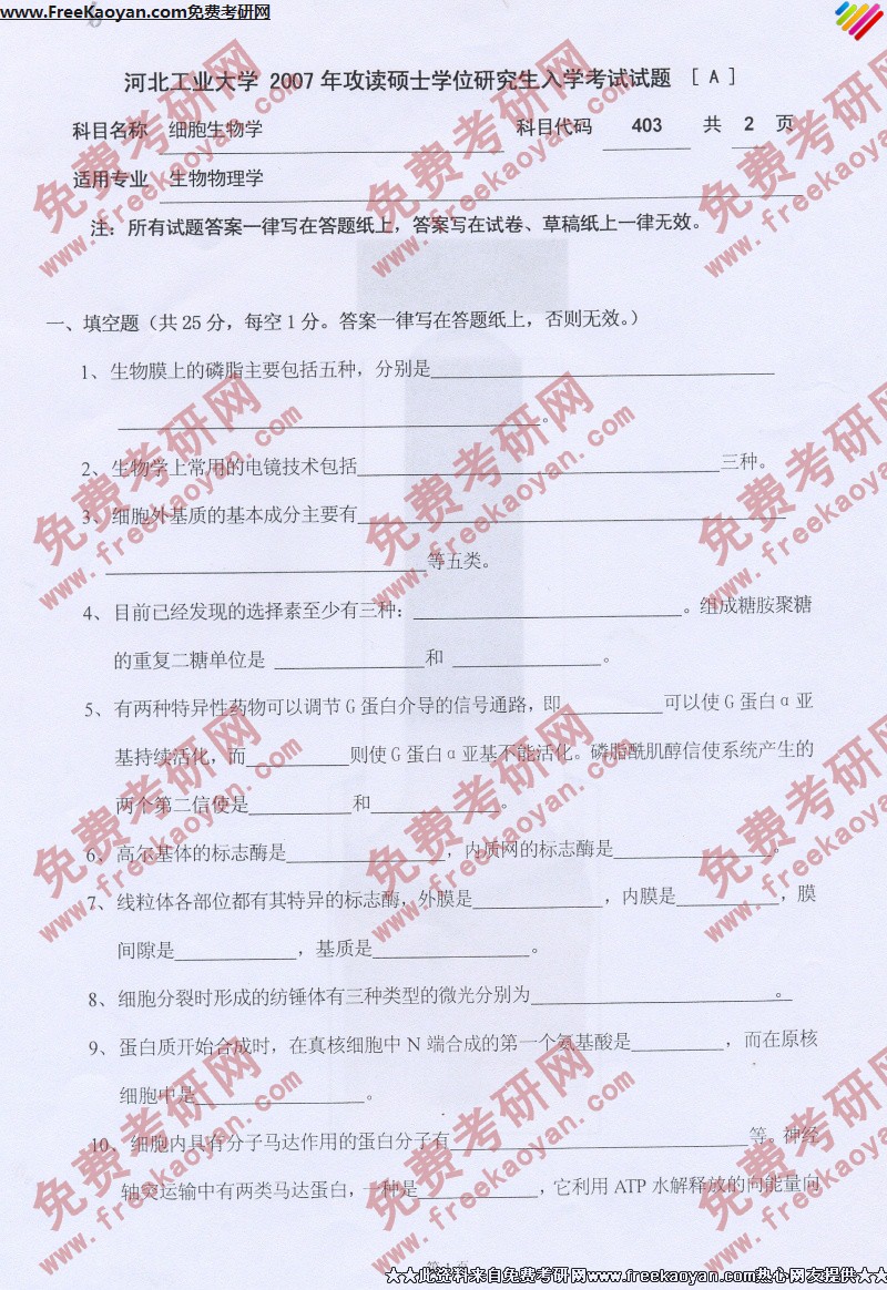 河北工业大学2007年考研真题-细胞生物学