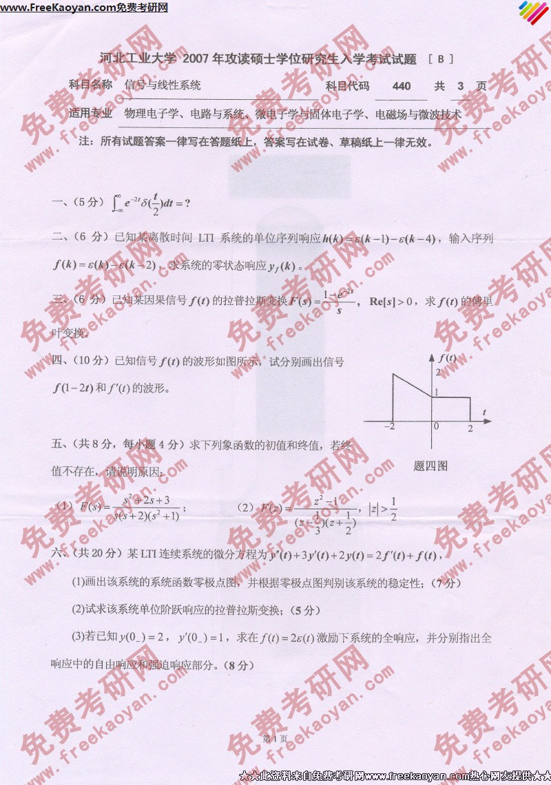 河北工业大学2007年考研真题-信号与线性系统