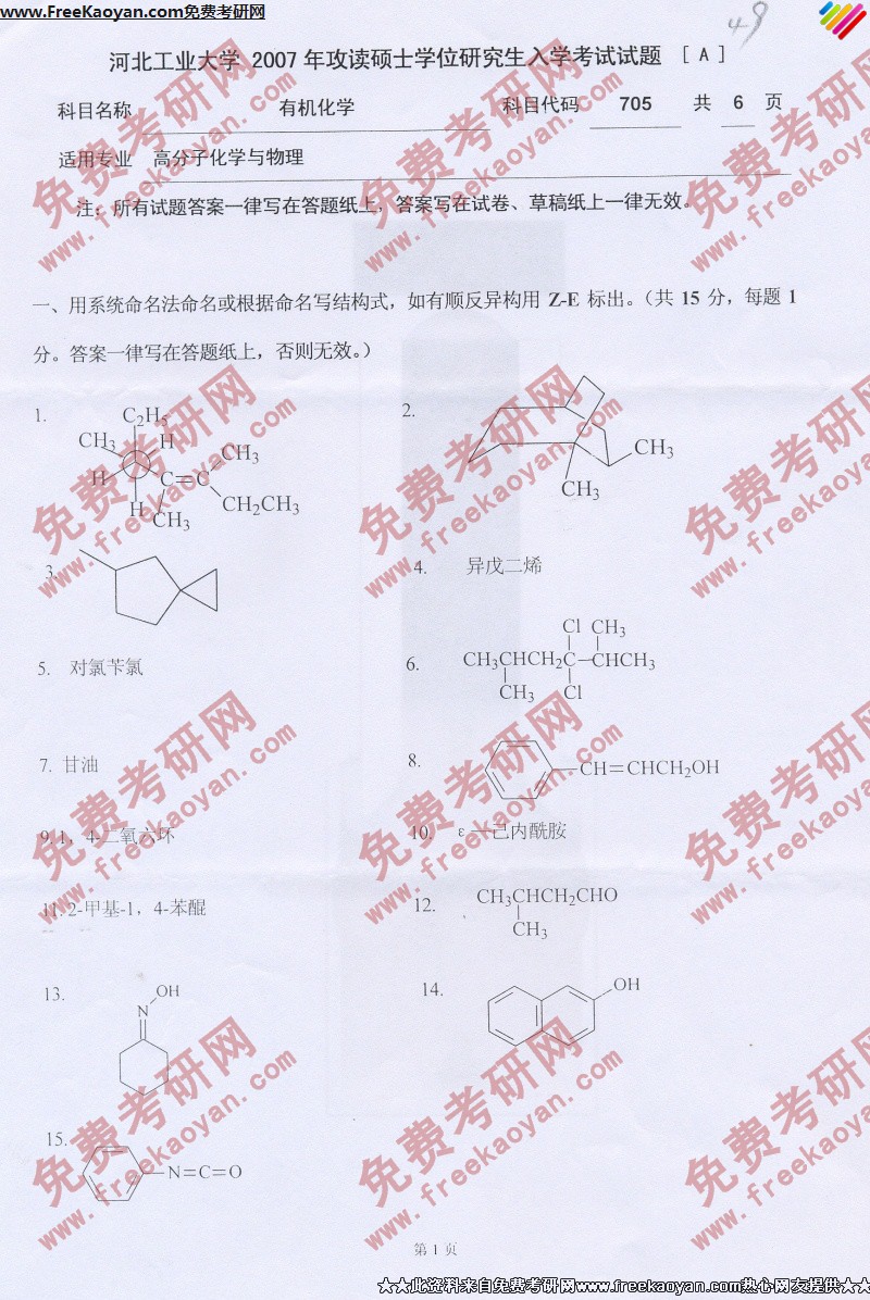 专业课考研经验 本站小编 FreeKaoyan 2018-01-23河北工业大学2007年考研真题-物理化学421