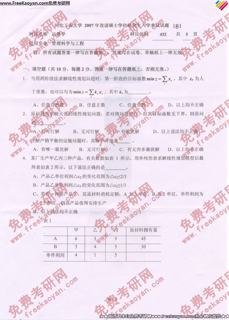 专业课考研经验 本站小编 FreeKaoyan 2018-01-23河北工业大学2007年考研真题-物理化学421
