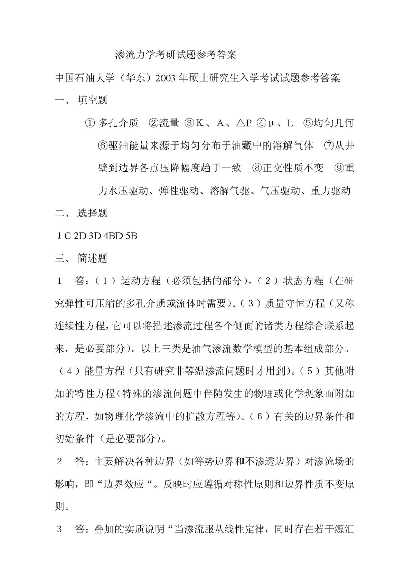 中国石油大学(华东)2003年考研真题-渗流力学参考答案