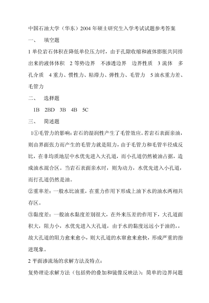 中国石油大学(华东)2004年考研真题-渗流力学参考答案