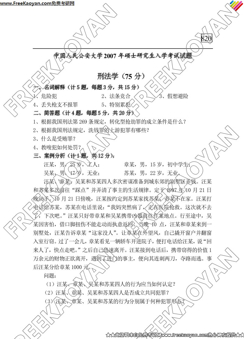 中国人民公安大学2007年考研真题-刑法学,刑事诉讼法学