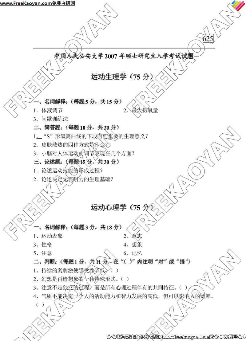中国人民公安大学2007年考研真题-运动生理学,运动心理学